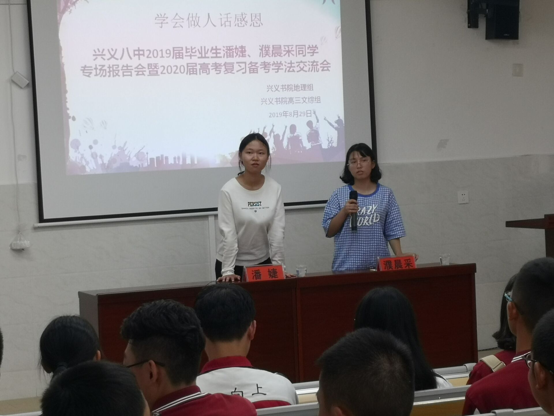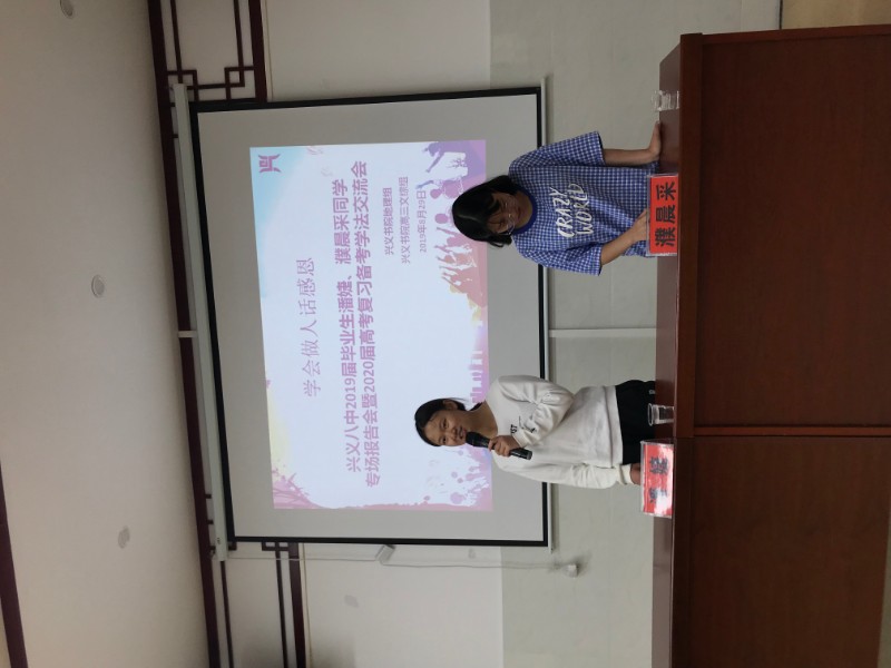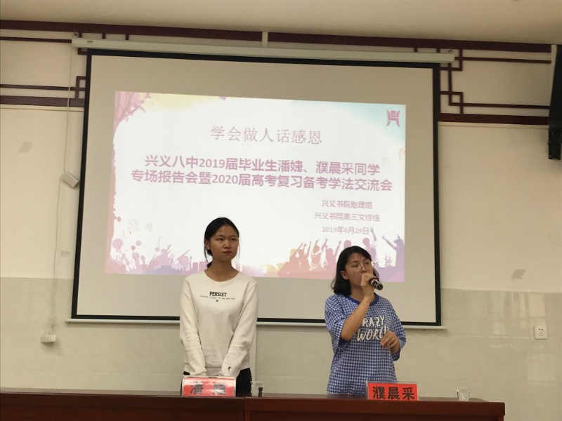 2019年8月29日(星期三,农历七月廿九)下午,兴义书院四个文科班师生齐聚博智楼,与来自兴义八中1618班的潘婕和濮晨采两位同学深入交流如何科学备考、如何调整心态、如何应对心理困惑等话题。