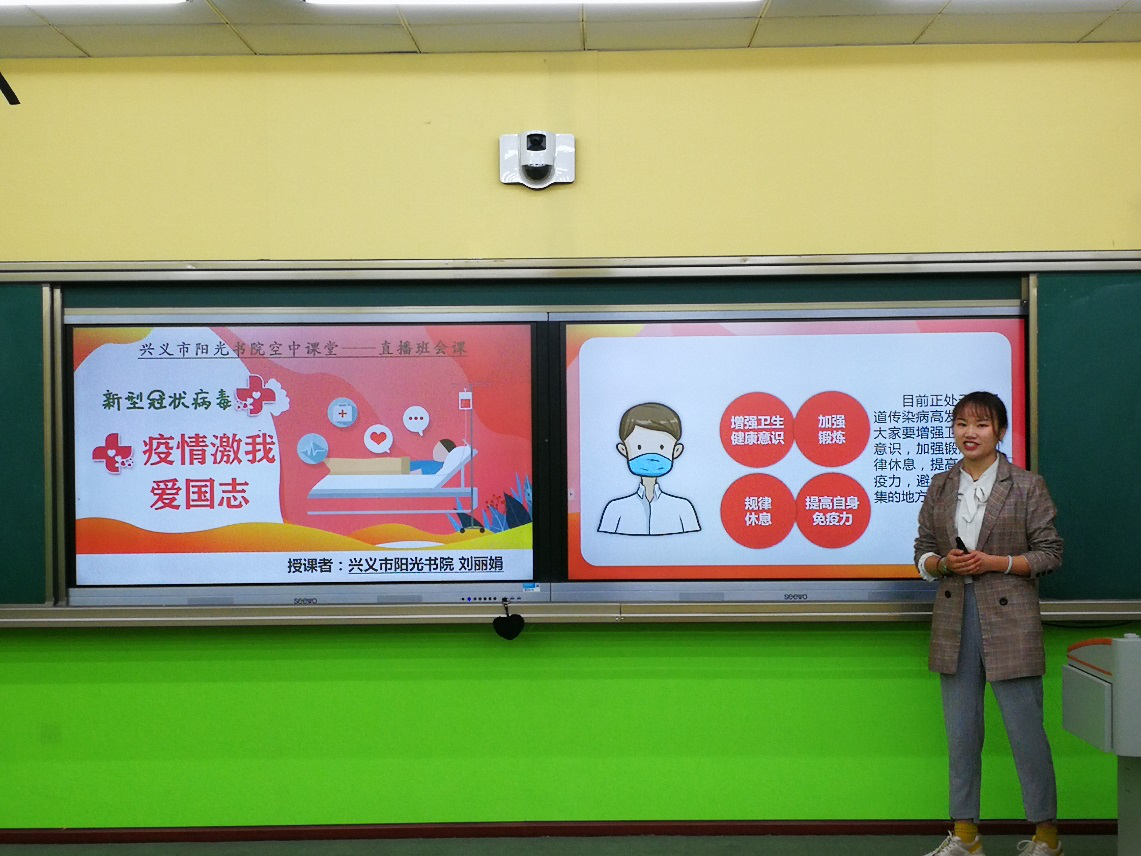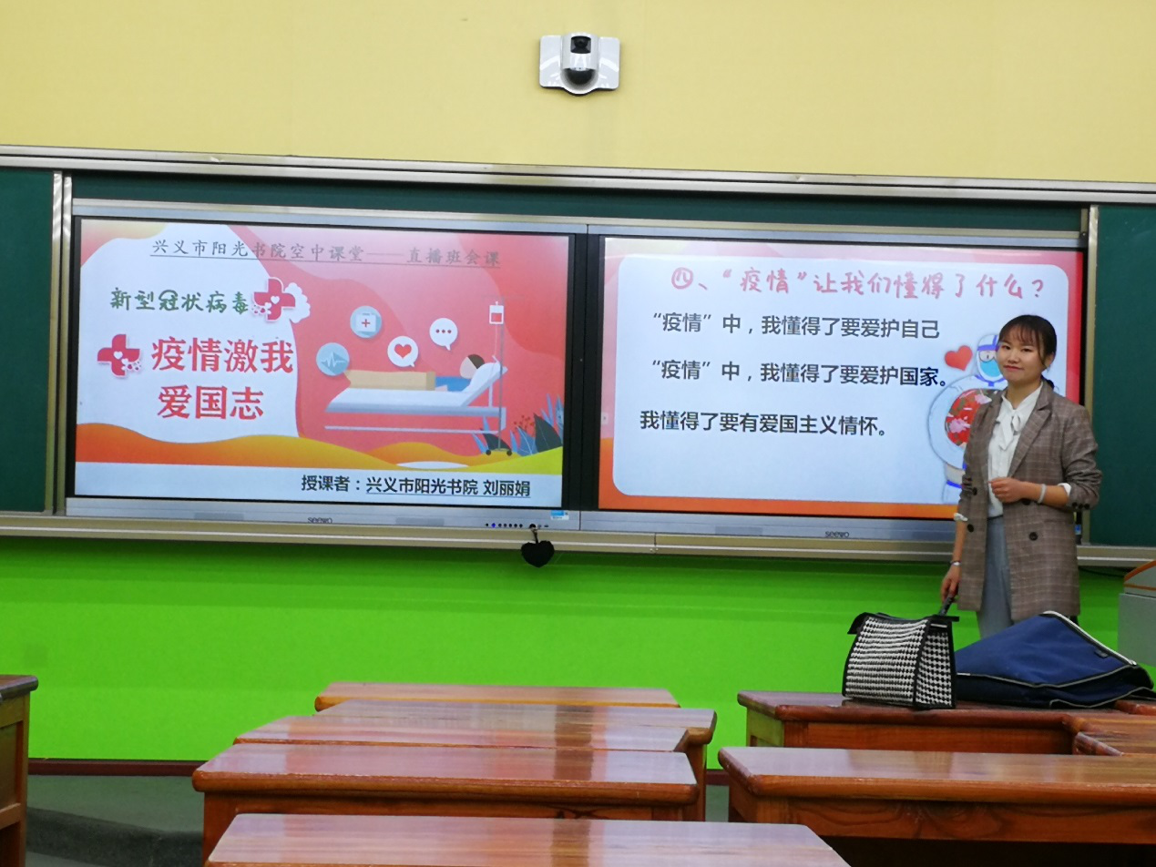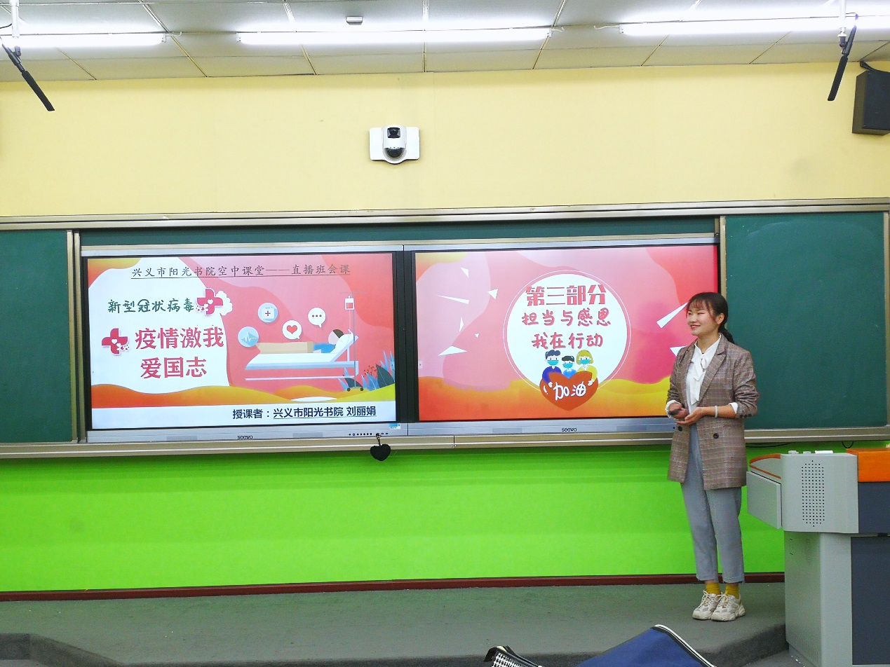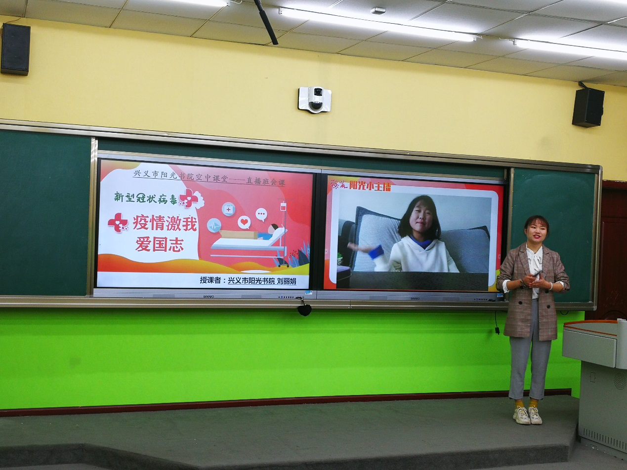 两位老师的直播课内容取材当下热点事件,很好的将“疫情防控”与爱国主义教育结合起来。阳光书院、兴义书院在非常时期的 “开学第一课”,必将成为我们学生疫情下终身难忘的人生第一课。