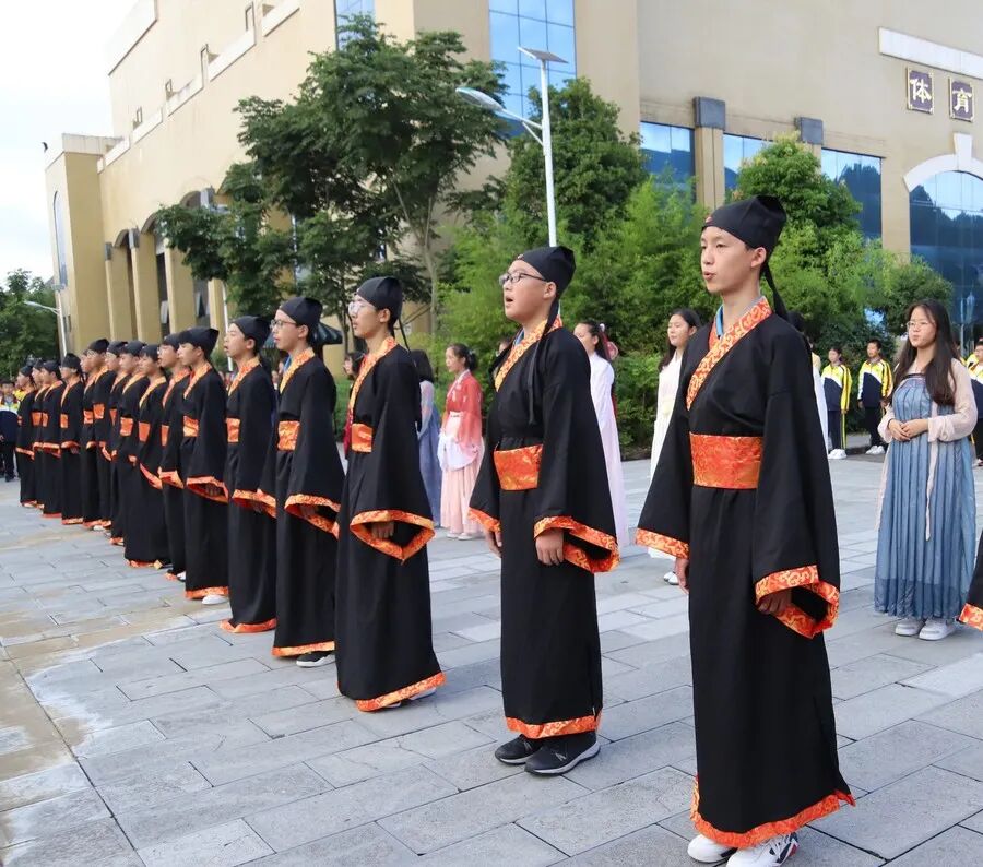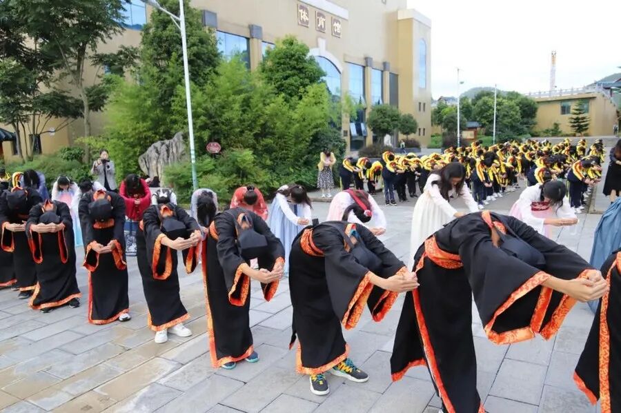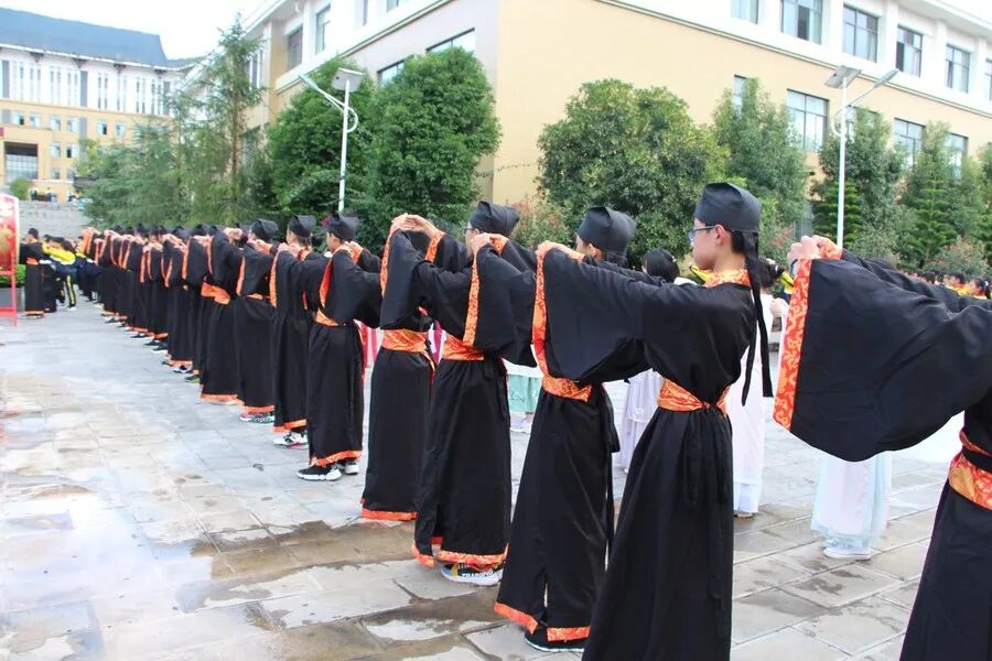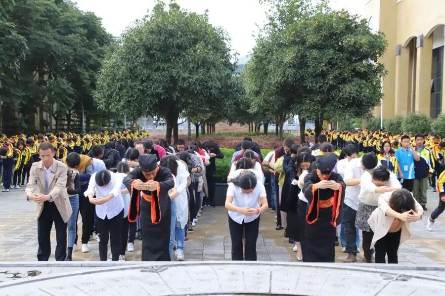 全体师生整理衣冠,端身正意,在主礼人宣读老师们撰写的诵文后,大家怀着一颗恭敬、感恩的心,向华夏先祖、大成至圣先师孔老夫子行三鞠躬礼。