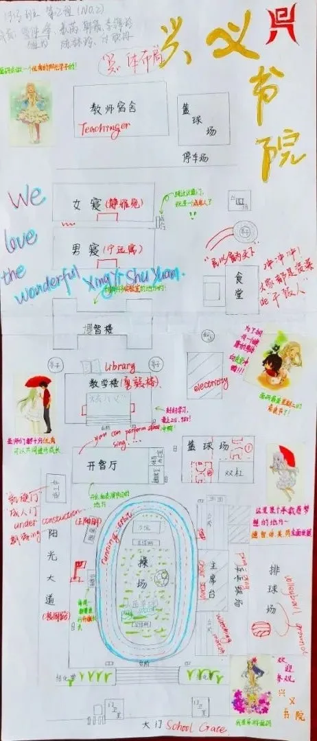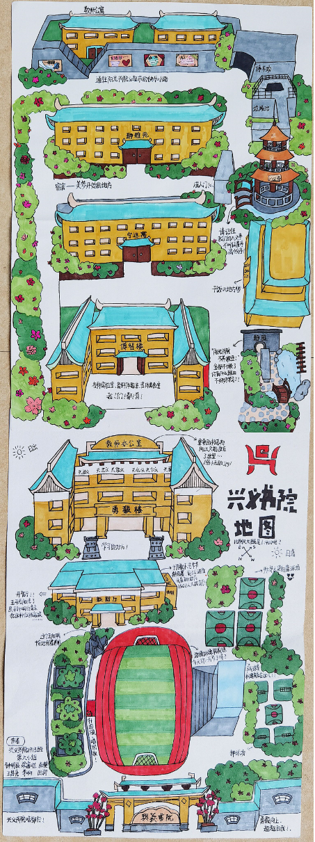 兴义书院地理学科组组织的“手绘家•校地图” 制作大赛已经是第三届,参与的同学们各显神通,尽其所能,结合所学知识和自己对学校或者家园附近的地理事象的了解,各自发挥自己的独特的才干,通过小组合作和独创等方式共同完成了作品。体现了“各美其美,美美与共”的合作精神和创新精神。本次活动共评出21幅优秀作品,其中一等奖4幅,二等奖8幅,三等奖9幅。