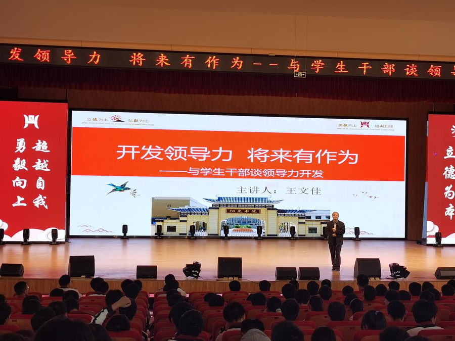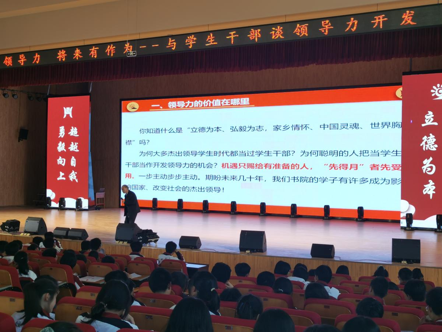 4月是我校“学会管理”主题月,为贯彻落实我校“3.5.1”素质教育工程,促进学生全面发展,2022年4月6日和4月7日下午,王文佳校长分别在初中部激智厅和高中部开智厅为我校学生干部开展了主题为《开发领导力,将来有作为》的讲座,初中部七、八年级,高中部高一、高二年级学生干部参加。