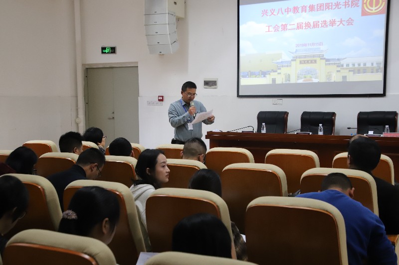 阳光书院第二届教职工代表大会(工会)换届选举于2019年11月15日举行,兴义八中教育集团工会主席余黔、阳光书院校长王文佳、常务副校长娄方华,上一届工会委员会成员以及学校60多名教职工代表参会,学校党支部书记、工会筹备领导小组组长陈跃昌主持。